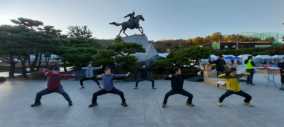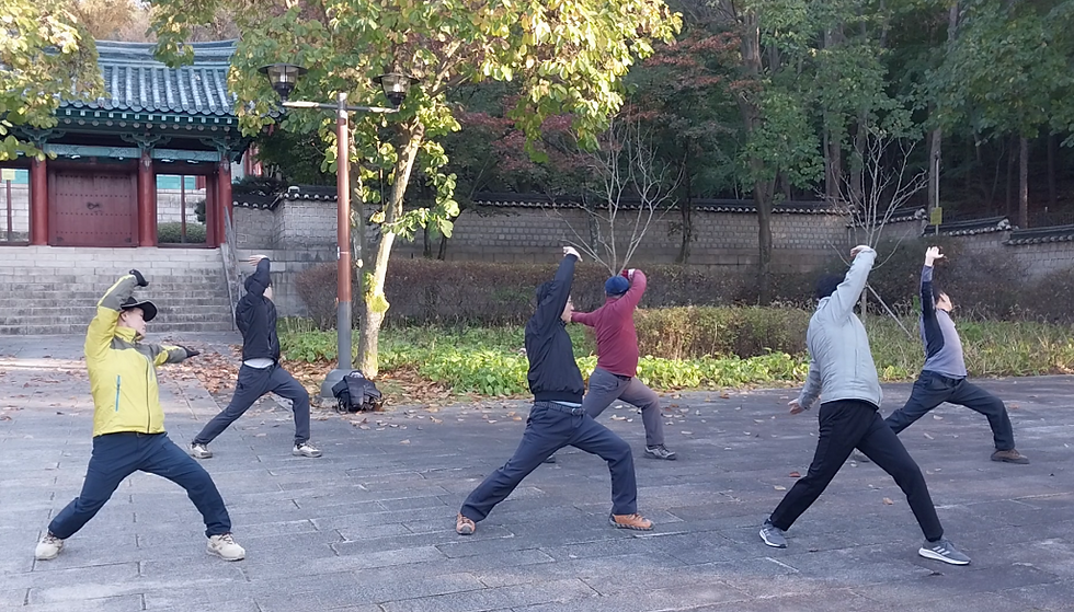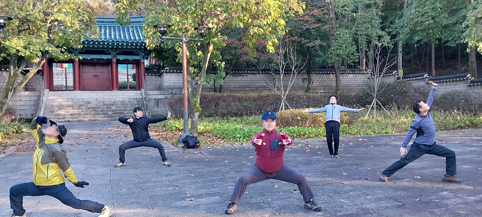 4. 강감찬 장군의 낙성대 사당 앞에서 중국 오형기공 (용과 호랑이 자세), 팔단금의 5 자세